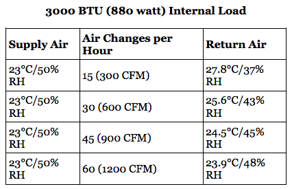 Total heat load (lights, equipment, people, infiltration through walls and ductwork, and make-up air) is the most important item affecting uniformity. If there were absolutely no load within the conditioned space, then uniformity would be easily handled. A 12’ x 10’ x 10’ room (1,200 cubic feet) with equipment, moving 600 CFM (30 air changes per hour) and a 3,000 BTU (880 watts) load has a temperature difference from supply to return of 2.6°C. If air is supplied at 23°C/50% RH and assuming there is no change in moisture content, than air is returned at 25.6°C/43% RH. Increasing airflow, or decreasing load can reduce this difference.