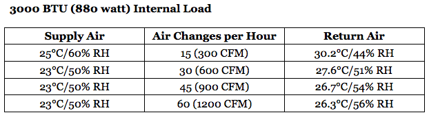 Total heat load (lights, equipment, people, and gain or loss through walls and ductwork) is the most important item affecting uniformity. If there were absolutely no load within the conditioned space, then uniformity would be easily handled, however this is not practical. For example: a 12’ x 10’ x 10’ room (1,200 cubic feet) with equipment, moving 600 CFM (30 air changes per hour) and a 3,000 BTU (880 watts) load has a temperature difference from supply to return of 2.6°C. If air is supplied at 25°C/60% RH and assuming there is no change in moisture content, then air is returned at 27.6°C/51% RH. Increasing total airflow or decreasing load can reduce this difference. At higher humidities, this same change in air temperature has a greater effect on the relative humidity.